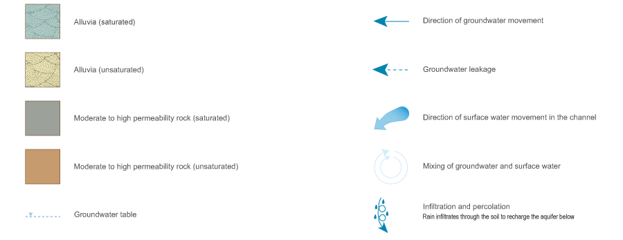 Click on elements of the model or select from the tabs below Alluvial aquifers with sustained surface water discharge downstream of damAlluvial aquifers are formed from particles such as gravel, sand, silt and/or clay deposited by fluvial processes in river channels or on floodplains. These deposits store and transmit water to varying degrees through inter-granular voids. These aquifers may have structures, such as dams, that modify the flow of both surface water and groundwater. Dams that provide a sustained release of surface water may increase recharge from the downstream channel into the alluvial aquifers, resulting in their saturation.