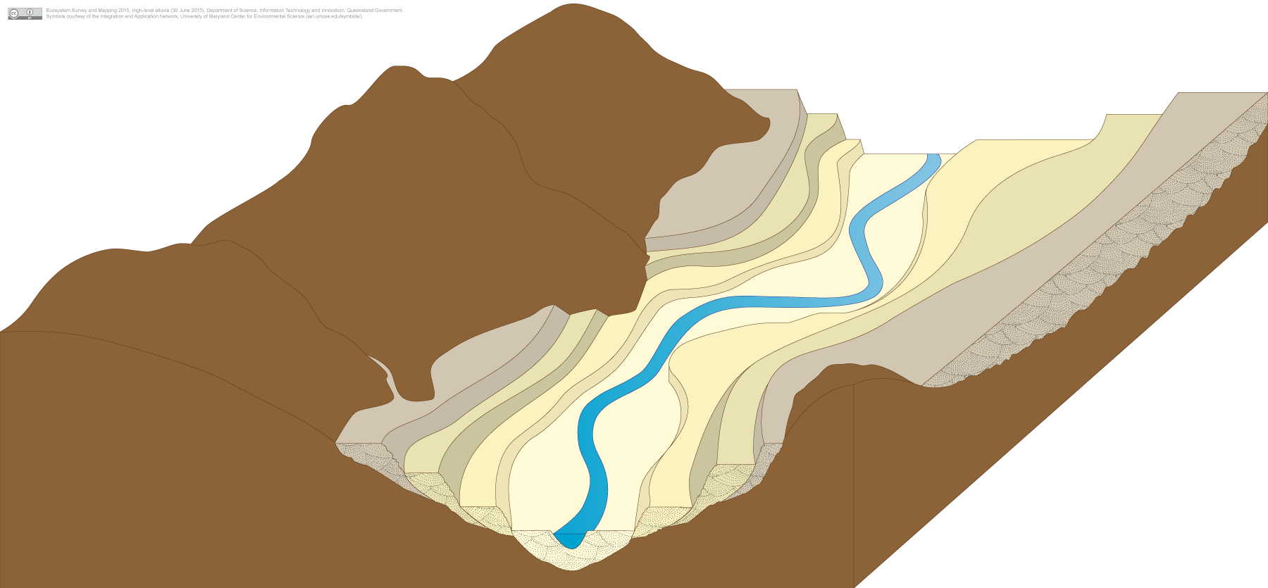 Click on elements of the model or select from the tabs below The term 'high-level' alluvial refers to deposition in ancestral valleys which are located above the channels in the current landscape in a form of inverted relief. Over time a channel will erode through older alluvial deposits resulting in older alluvia appearing in the banks above the channel. Pictorial conceptual model PDF Additional links Last updated: 18 December 2015 This page should be cited as: Queensland Government, Queensland (2015) High-level alluvia, WetlandInfo website, accessed 8 May 2025. Available at: https://wetlandinfo.des.qld.gov.au/wetlands/ecology/aquatic-ecosystems-natural/groundwater-dependent/alluvia-high-level-overlap/ |