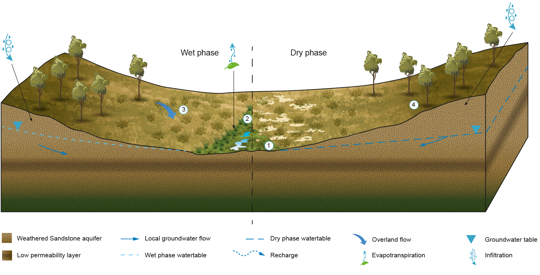 The wetlands have formed due to a local groundwater flow system overlying a lower-permeability weathered substrate. Lateral gravity-driven flow paths result in point discharge zones (wetlands) within the valley floors. Four focal zones are described that represent the variability across the wetlands driven by the groundwater regime.