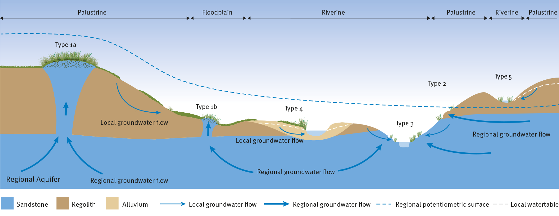 Type 5: Wetlands located within riverine-to-palustrine environments with shallow-to-nil unconsolidated material. These wetlands can form in areas of where there is significant topographic variation, such as the recharge areas of the Great Artesian Basin..