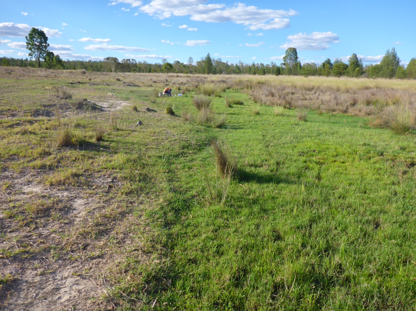 Wetland to non-wetland transition zone. This zone occurs in a fringing areas of the wetland outside of the discharge area and mound. Soils in this area are saturated with little free water. The area is dominated by grasses including Cenchrus purpurascens, Sacciolepis indica, Isachne globosa and Arthraxon hispidus, a range of forbs such as Ranunculus lappaceus and the fern Cyclosorus interruptus. These species are generally associated with permanent saturation. However, this zone also includes a small proportion of terrestrial species, such as Imperata cylindrica or Dianella longifolia, particularly near the wetland boundary.