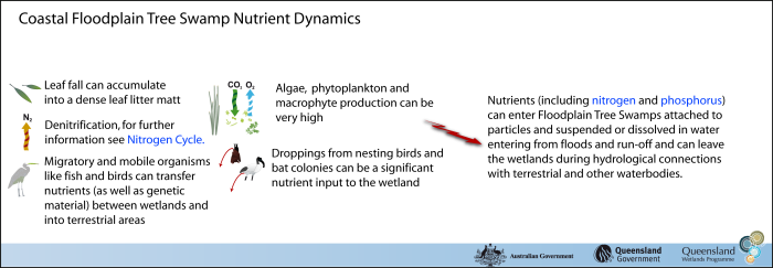 Sources of nutrients include nutrients carried in surface water flow into the wetland habitat. Droppings from nesting birds and bat colonies can also be a significant nutrient input to the wetland. Nutrients can leave these coastal floodplain tree swamps through the same mechanisms—through water flow out of the wetland habitat, and migratory and mobile organisms (such as birds) transporting nutrients to other parts of the terrestrial or estuarine landscape. Nitrogen can be transferred from the wetland into a less biologically available form in the atmosphere through the process of denitrification. High levels of organic carbon, high temperatures, high nutrients (particularly nitrate) and low levels of oxygen in areas inundated with water create ideal conditions for denitrification to occur. Melaleuca spp. trees can survive under conditions comparable with nutrient enrichment by sewage and therefore can be a considerable store or source of nutrients, depending on conditions. Melaleuca spp. trees transfer nutrients from the sediment and water column into plant growth and then into senescent leaf fall. Fallen Melaleuca leaves break down very slowly due to their high carbon content (which is largely made up of decay-resistant lignins) and anti-bacterial compounds. Leaves can therefore accumulate on the ground to form a dense leaf litter matt. This litter matt can be a long-term nutrient store in Melaleuca wetlands as, even during flooding conditions, the matt can remain intact, only losing freshly fallen leaves through physical removal and leaching soluble organics (not nitrogen and phosphorus). Though Melaleuca forest production is relatively high, algae (in the shallows), phytoplankton (in deeper waters) and macrophyte production can be even higher in these habitat types, with faster growth and recycling rates.