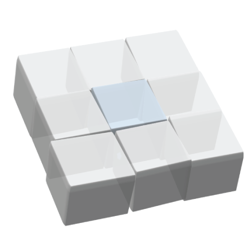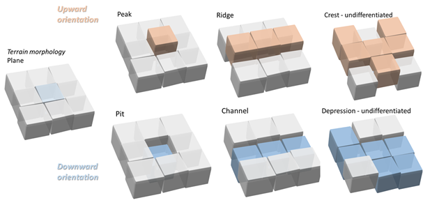Morphological features can provide the structural complexity that creates many microhabitat types and increases biota diversity and abundance[4][3]. Channels and depressions are often high in structural complexity, providing conduits for water flow and currents. Different morphologies of the landscape can be biodiversity hotspots for fish and benthic infauna (e.g. filter feeders), providing corridors for mobile fauna. Terrain morphology can determine habitat connectivity - reducing or providing ongoing connections. There are three elements that characterise terrain morphology: (i) orientation and (ii) morphology units and (iii) morphology patterns. (i) Orientation describes whether the landscape unit it is ‘up’ ‘down’ or ‘flat’. Simple terrain morphology can be classified by its orientation. Automated tools for determining orientation from a digital terrain model include Topographic Position Index, an index between 1 (up), zero (planar) and -1 (down)[5]. Morphological units can be described using seven fundamental elements - plane, peak, pit, ridge, channel, crest and depression. In the figures above, each of the cubes represent a value of elevation relative to a plane in a digital terrain model. The colours represent their orientation i.e. grey for planar, brown for up, blue for down.
