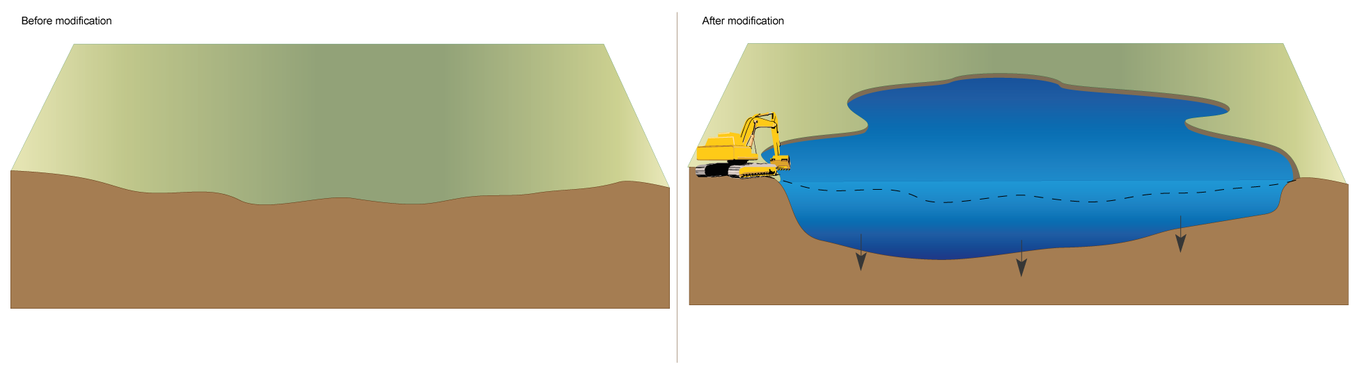 Excavation – Excavation creating an artificial wetlandSelect from the tabs below Excavation forming an artificial palustrine or lacustrine wetlandExcavation outside natural and/or modified natural wetlands is often intended to capture overland flow (i.e., surface water runoff) and may create an artificial palustrine or lacustrine wetland. Applicable Wetland Habitat Hydrological Modification: