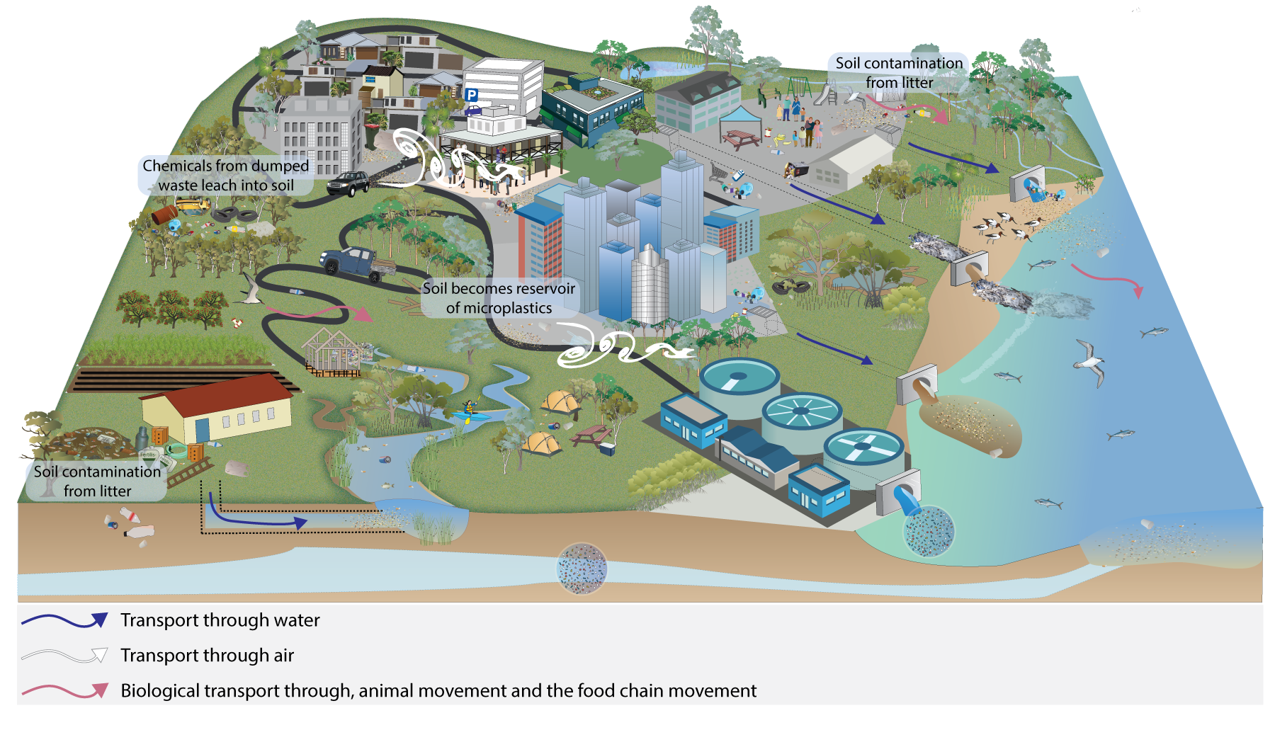 Cigarette butts continue to be the most littered item in Queensland. The Queensland Government commissioned comprehensive data collection and analysis of littered waste (other than cigarette butts) before and after the introduction of the the container refund scheme. Beverage containers, straws and takeaway containers were the most consistently littered items[1]. Soil contamination can also occur from e-waste products, and can impact plants, animals and water due to the presence of heavy metals such as lead, cadmium and chromium[3]. The issue of microplastics in soils and other terrestrial systems continues to be addressed. There is evidence that soils may represent the largest global reservoirs of micro plastic, including nanoplastic[5]. This means that soils present many potential ways of exposing wildlife and humans to microplastics and nanoplastics. Plastics in soil can come from many sources, including microplastics in waste water, microplastics that blow off landfill sites and mulched plastic on agricultural fields. A literature review reported that virtually all agricultural soils, (including arable lands, paddy lands, uplands, irrigation, and greenhouse soils), receive various sources of plastic contaminants[4] References