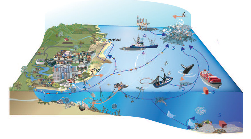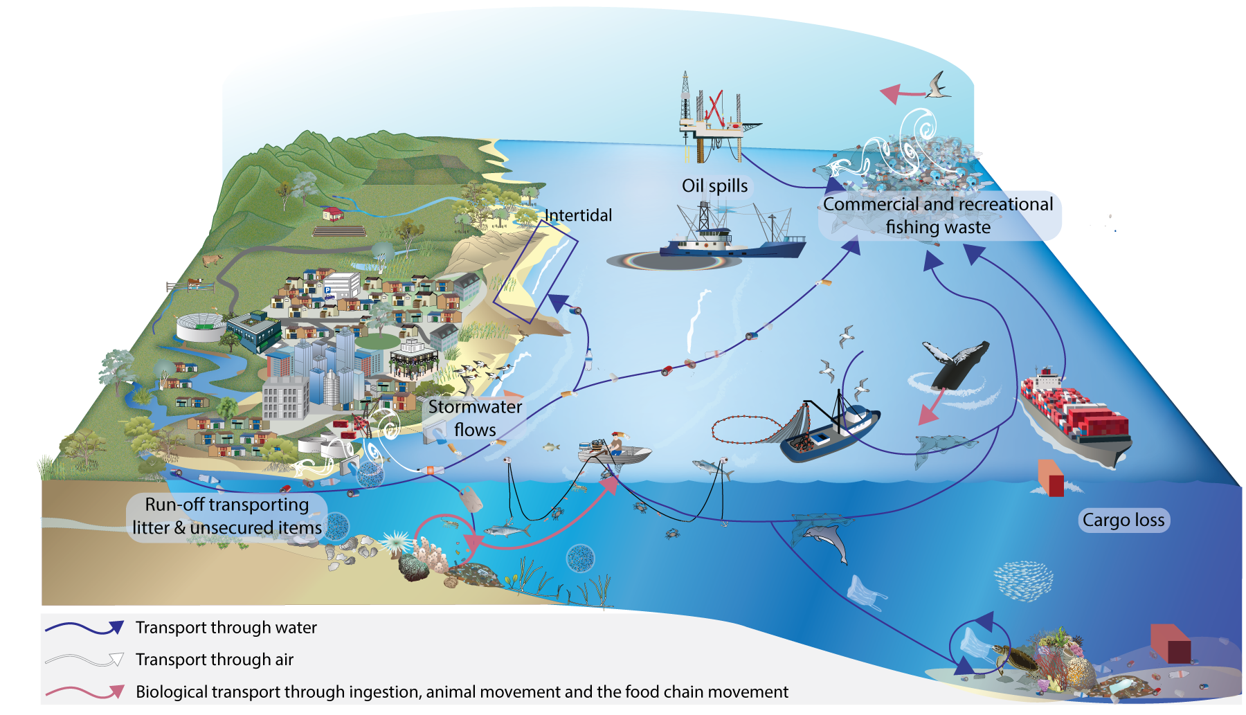 Marine and IntertidalMarine![]() Waste pollution in the marine environment has been more widely studied than many other environments. For example, there are five times more studies conducted on microplastics in marine environments than freshwater or terrestrial environments[12]. Waste data in the Australian Marine Debris Initiative (AMDI) Database, shows that since 2004 over 15 million pieces of data (i.e. littered items) have been input into the database, demonstrating the true extent of this problem. Marine debris can result from many sources, including sewage effluent, stormwater, recreational activities (e.g. water sports) and commercial activities (e.g. fishing)[6]. There are now five gyres of waste on the ocean surface, including the Great Pacific Garbage Patch, a raft of plastic waste, chemical sludge and other debris almost the size of the state of New South Wales[11]. Studies of marine debris in Queensland[2] found that debris abundance was relatively low across the reefs of the Great Barrier Reef. The highest debris loads were recorded in South East Queensland near coastal cities and high use areas. The categories of debris included fishing line, fishing nets and general waste[19]. Plastic pollution in the oceans is a priority environmental issue[14]. Approximately eight million metric tonnes of plastic enter the world’s ocean each year. The issue of marine litter was highlighted when a plastic bag was found in the deepest part of the ocean, the Mariana Trench, at a depth of 10,926 metres[11]. Globally, half of all surface plastic accumulates in sub-tropical currents[18]. For example, debris along the northern coast of Australia is driven into the Gulf of Carpentaria by oceanic currents. Eco Barge Clean Seas Inc has been running the Whitsunday Marine Debris Removal Program since June 2009. To date, it has removed over 255,000 kilograms of marine debris from the Whitsunday region. Other community groups assist in removing large amounts of debris from marine waters. For example, The Jolly Rogers Fishing Club has collected tonnes of plastic from rivers around Rockhampton. Funds collected from for recycling, e.g. bottles, supports other community programs.[19] Ocean surfaceIt is estimated that between 15 and 51 trillion plastic particles are floating on the ocean surface. Further, this may be less than one percent of the total plastic estimated to have entered the ocean[7] In Australia, sea surface plastic concentration is approximately 4,000 pieces per square kilometre, made up predominantly of small fragments from items such as packaging and fishing material[15]. A wide range of ocean currents transport these plastics from international and domestic sources, including populated areas of Australia's east coast. Plastic contamination levels in the surface waters of Australia are similar to those in the Caribbean Sea and the Gulf of Maine, but are considerably lower than those found in the Mediterranean Sea[15]. Water columnInformation is scarce about waste pollution in the water column (between the surface and floor of the ocean). However, a few studies have demonstrated the presence of microplastics in sub-surface waters and deeper layers of the water column. Plastics can be neutrally buoyant and float in the water column. The first measurement of microplastics in the water column occurred in 2018[6], with high microplastic levels found 5-15 metres below the surface. Concentrations were higher near the coast, indicating that land-based activities may be a major source of these microplastics. Three quarters of the microplastics were fibres of unknown composition or origin[6]. Another study found that 95.5 percent of the microplastics found three metres below the surface were fibres. At a depth of two hundred metres, approximately fifteen pieces of plastic were found in every litre of water. This is almost the same concentration as in surface currents[5]. In open oceans, microplastic polymers segregate in the water column according to their density. Lower density polymers, such as polypropylene and polyethylene, dominate sea surface areas but decrease in abundance in the water column (three percent in the deep sea). Denser polymers, such as polyesters and acrylics, can reach very deep waters (five percent in surface seawater compared with 77 percent in deep-sea locations)[8]. Like freshwater environments, biofouling and density changes can result in plastic moving between different parts of the water column. Ocean floorThe ocean floor (benthos) accumulates high-density plastics, low density plastics that living things have attached to (biofouling) and other waste pollution. It has been suggested that what is seen on the sea surface is less than half a percent of the total waste in the ocean[4]. Based on the amount of plastic entering the ocean and the ways it is known to sink, 196 million tons of plastic may have settled on the ocean floor since 1950[17]. In European waters in 2010, up to 100,000 pieces of waste visible to the naked eye were counted per square kilometre of sea floor. In Indonesia, the figure was even higher with up to 690,000 pieces per square kilometre. Another study found an estimated 1.8 million pieces of plastic, old tyres and fishing gear on the sea floor[18]. A tripling of plastic waste at the bottom of the Mediterranean has occurred since 1990[18]. Practical actions that can help managers reduce waste pollution in Marine sinks include: