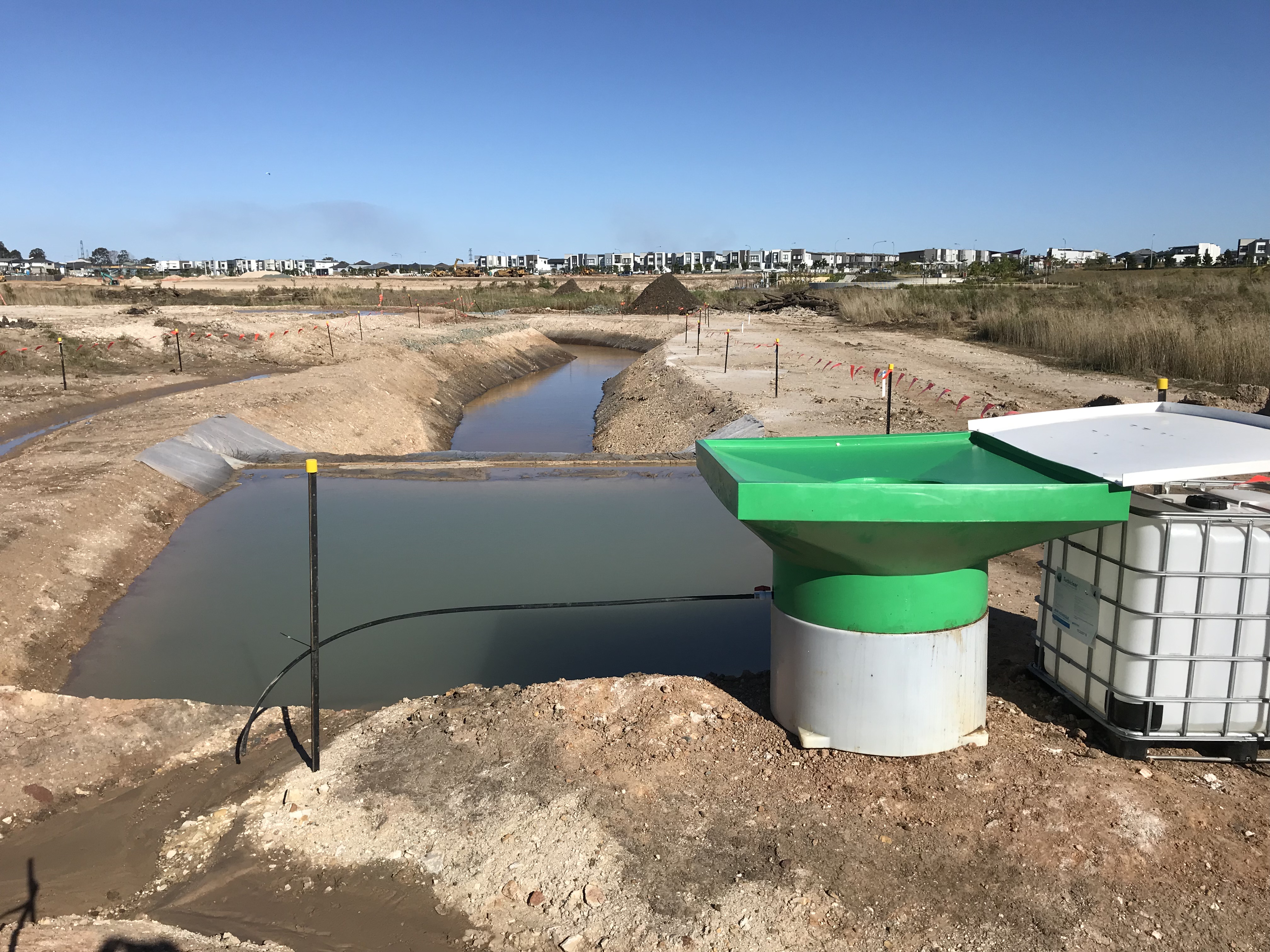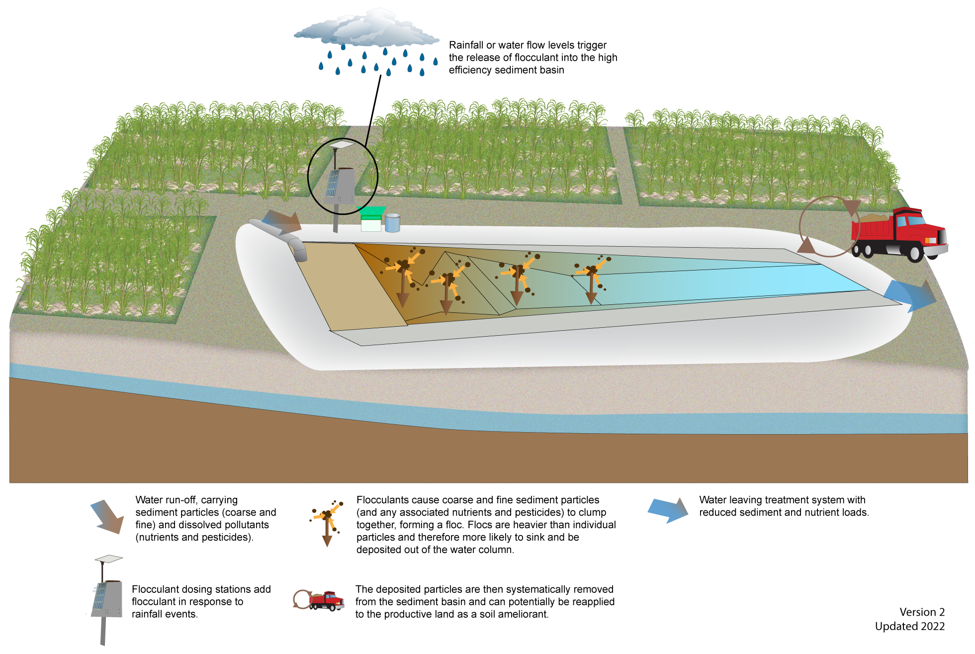 High efficiency sediment basinsHigh efficiency sediment basinsSelect from the tabs below Other name/sHES basin DescriptionA High efficiency sediment (HES) basin is a structure designed to capture sediment entrained in runoff (known as tailwater) or stormwater runoff by adding clarifying agents (coagulants and flocculants) to increase the settlement of suspended sediments. Fine colloidal clay particles washed from intensive agricultural areas by excess irrigation water and stormwater runoff can also carry a significant load of environmental pollutants (nutrients and pesticides) to receiving aquatic environments. Clay particles stay in suspension for long periods unless chemically modified by a clarifying agent to promote flocculation and settlement. The HES basins use automated (rain or flow activated) dosing to promote sedimentation of colloidal clay particles. The basin design promotes slow flow conditions to prevent re-suspension of settled particles. The basins can be drained (water recycled back on to productive cropping land) and the accumulated sediments dried and returned to productive land as a soil ameliorant. (Subject to ensuring that the aluminium content of the material and other factors are acceptable for agricultural use). HES basins are generally used in areas where there are fine suspended sediments and colloidal clays with attached nutrients and pesticides. The dosing system can be efficiently retrofitted to existing sediment basins or other artificial waterbodies. If designed and operated correctly HES basins can have significant water quality benefits by ensuring that both coarse and fine sediments are removed from tailwater or stormwater runoff, and any associated nutrients and pesticides captured, before the water enters natural waterways. There is a risk of overdosing with the clarifying agent and this must managed with appropriate control, such as batch testing to determine the appropriate dosage. The main services include: